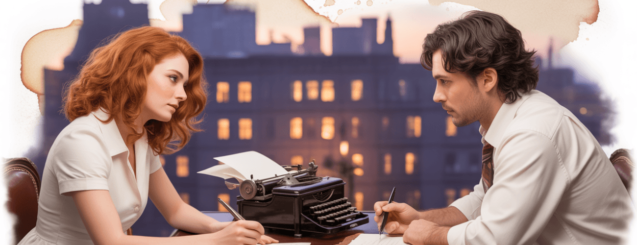The scent of fresh paper and spilled ink hung thick in the cramped room, where the soft hum of a vintage typewriter filled the air. Lila paced back and forth, clutching a stack of handwritten notes. Across the table, a stranger — tall, with sharp eyes and an easy smirk — was already tapping away at his own keyboard.